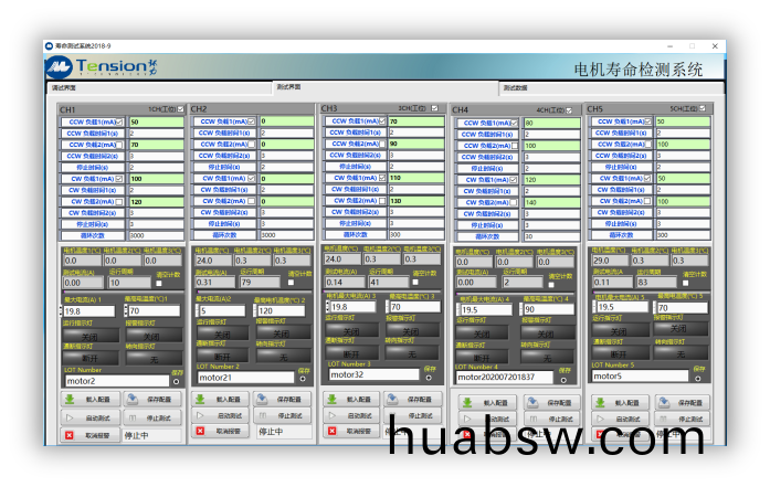 •可以(yi)通(tong)过(guo)改变(bian)制动器电(dian)流(liu)来设(she)定不同的电机(ji)加载(zai),同(tong)时(shi)可以(yi)通过上位(wei)机(ji)软(ruan)件(jian)任意设(she)定电机的工作与(yu)停止时(shi)间(jian),最(zui)高工(gong)作(zuo)循环(huan)为(wei)99.99万(wan)次,循(xun)环(huan)次(ci)数达(da)到(dao)后(hou)自(zi)动(dong)停(ting)机(ji),其(qi)中(zhong)任(ren)何(he)一(yi)工(gong)位出(chu)现问(wen)题只会自(zi)动停(ting)止该工(gong)位的运(yun)行
