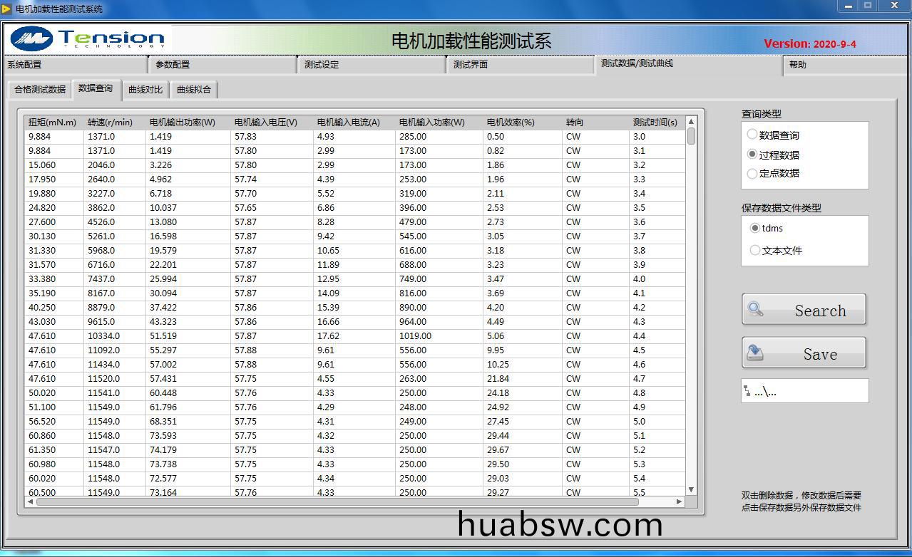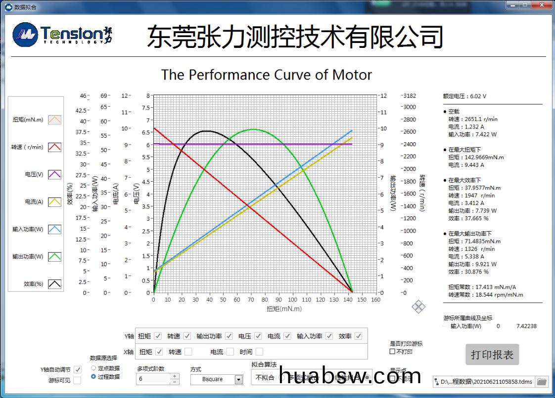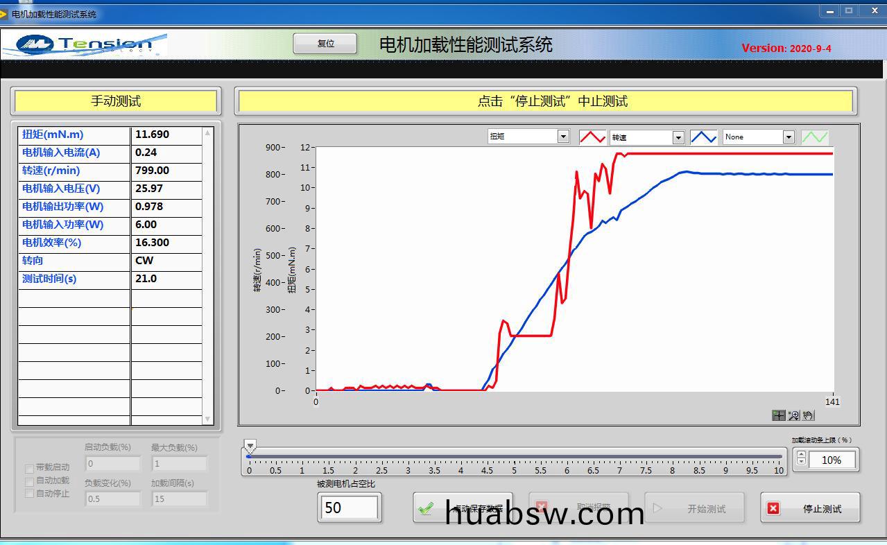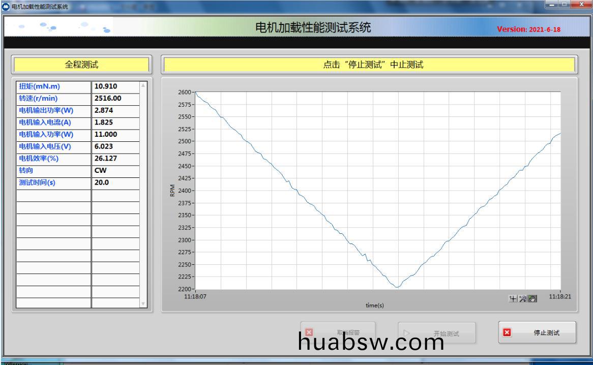 2.定点测(ce)试:实(shi)时(shi)显示(shi)电(dian)机的电压、扭矩(ju)转速(su)、电(dian)流(liu)、输(shu)入功(gong)率(lv)、输(shu)出(chu)功率(lv)、电(dian)机效率和(he)测(ce)试(shi)时间等参(can)数,以(yi)便(bian)在测试过(guo)程(cheng)中(zhong)实(shi)时看(kan)到(dao)当(dang)前(qian)数(shu)据(ju)。还(hai)可以在(zai)不(bu)加载(zai)时(shi)观(guan)察(cha)到电机的(de)空载(zai)转(zhuan)速,以及在电机(ji)在(zai)堵(du)转前所加(jia)载(zai)的扭矩。