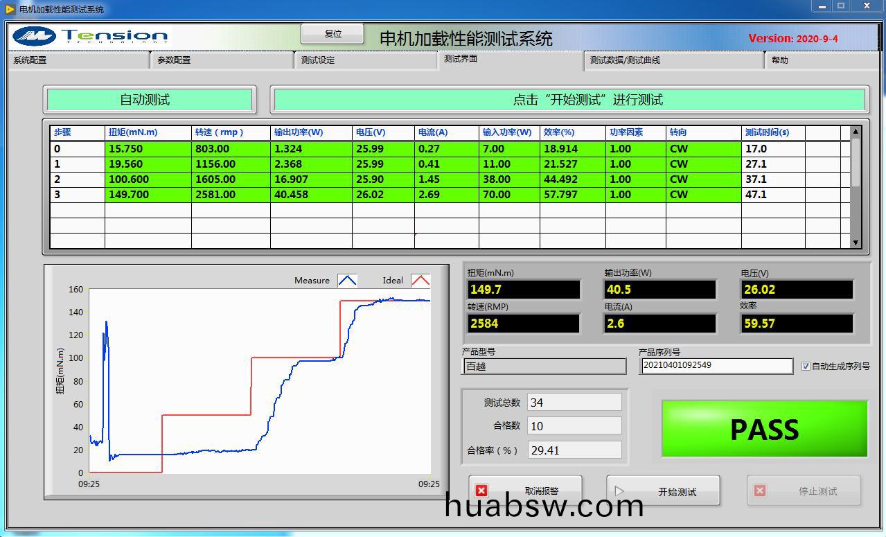 3.合(he)格不(bu)合格(ge)测(ce)试:(含正反转测(ce)试(shi))通(tong)过(guo)上(shang)位(wei)机(ji)软(ruan)件将(jiang)被(bei)测(ce)电机(ji)运行在设定的额定电压下(xia),通(tong)过测试软件(jian)让测功机(ji)输出(chu)设定负载,系统(tong)可调(diao)用工程(cheng)设定(ding)好在(zai)某个负载的(de)给(gei)被(bei)测产品设置(zhi)的(de)上(shang)下(xia)限(xian),并判(pan)断当前测量参数是否(fou)在其范(fan)围。
