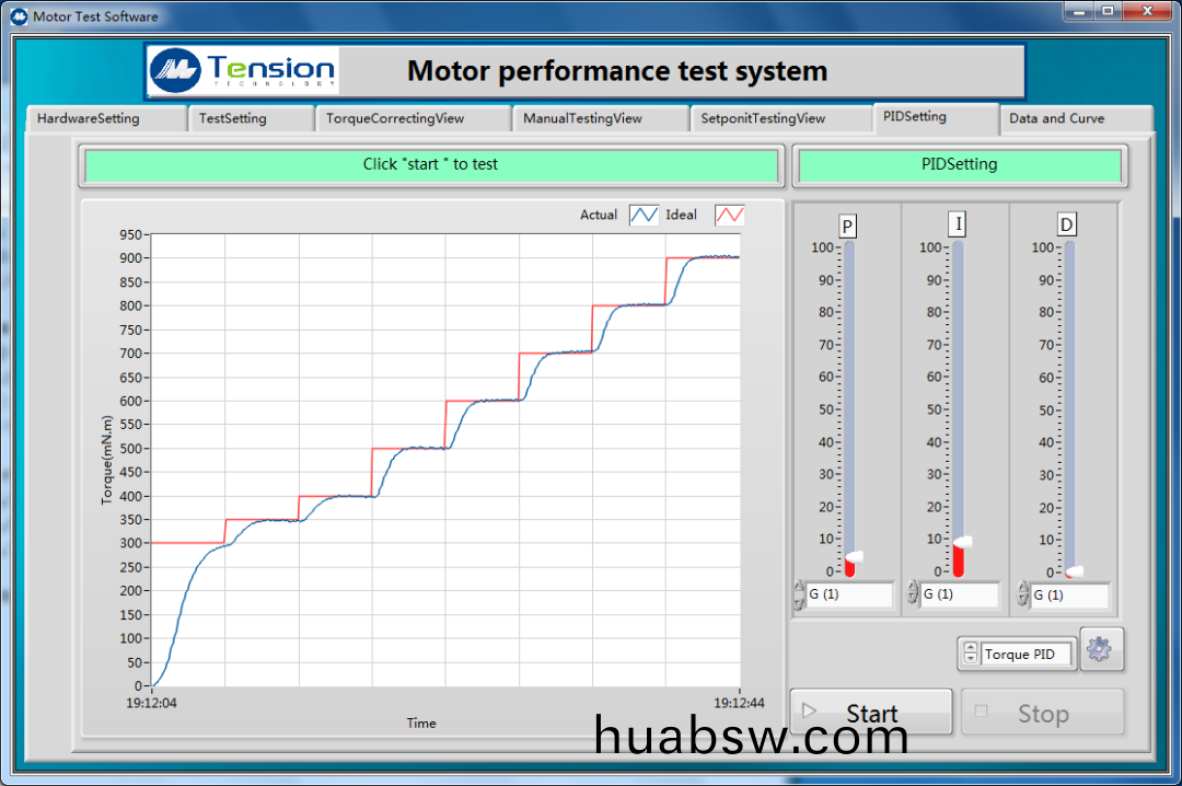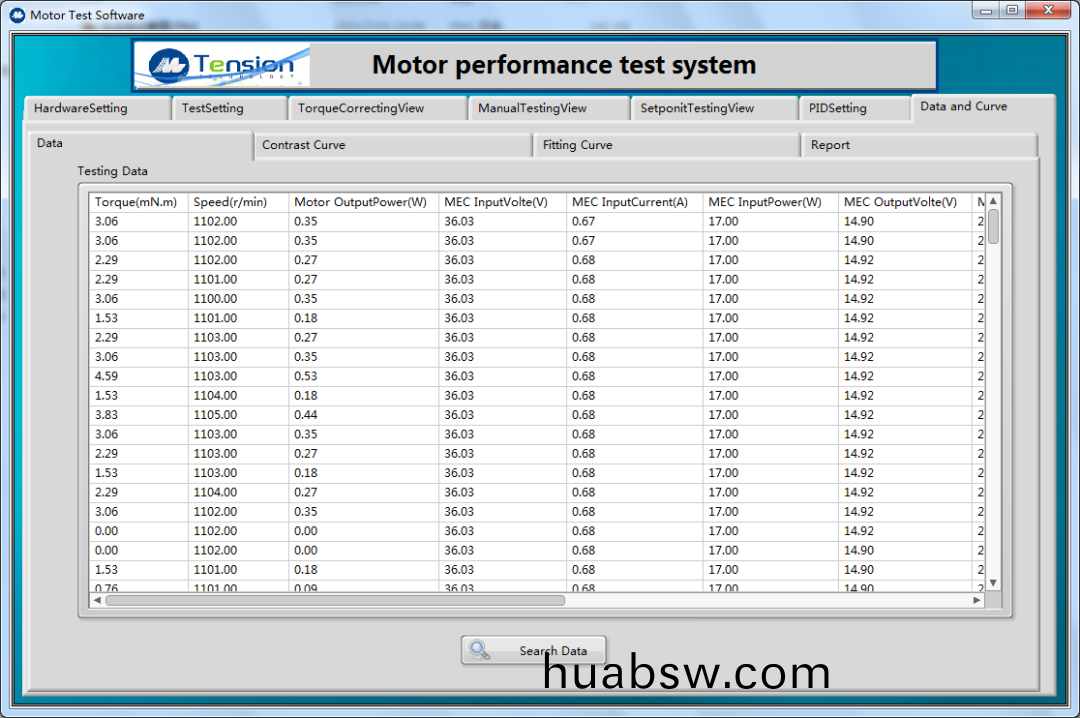 1.手(shou)动(dong)测试(shi):通过(guo)上位机(ji)软件将(jiang)被(bei)测(ce)电(dian)机运(yun)行在(zai)设(she)定(ding)的(de)或额定电压下(xia),通过操(cao)作员拉动软(ruan)件上的加载(zai)滚(gun)动条(tiao),来(lai)控制(zhi)测功机给(gei)被(bei)测(ce)电(dian)机(ji)加载,并(bing)实(shi)时(shi)显示(shi)测试的(de)数(shu)据(ju)与曲(qu)线(xian),如(ru)工(gong)作(zuo)特(te)性曲(qu)线图(tu),T/N,T/I曲线(xian)等(deng)(具有单(dan)点(dian)手动控制功(gong)能(neng),按设定(ding)的(de)控制模式和(he)设定(ding)的控(kong)制量(liang)控制(zhi)电(dian)机工况)