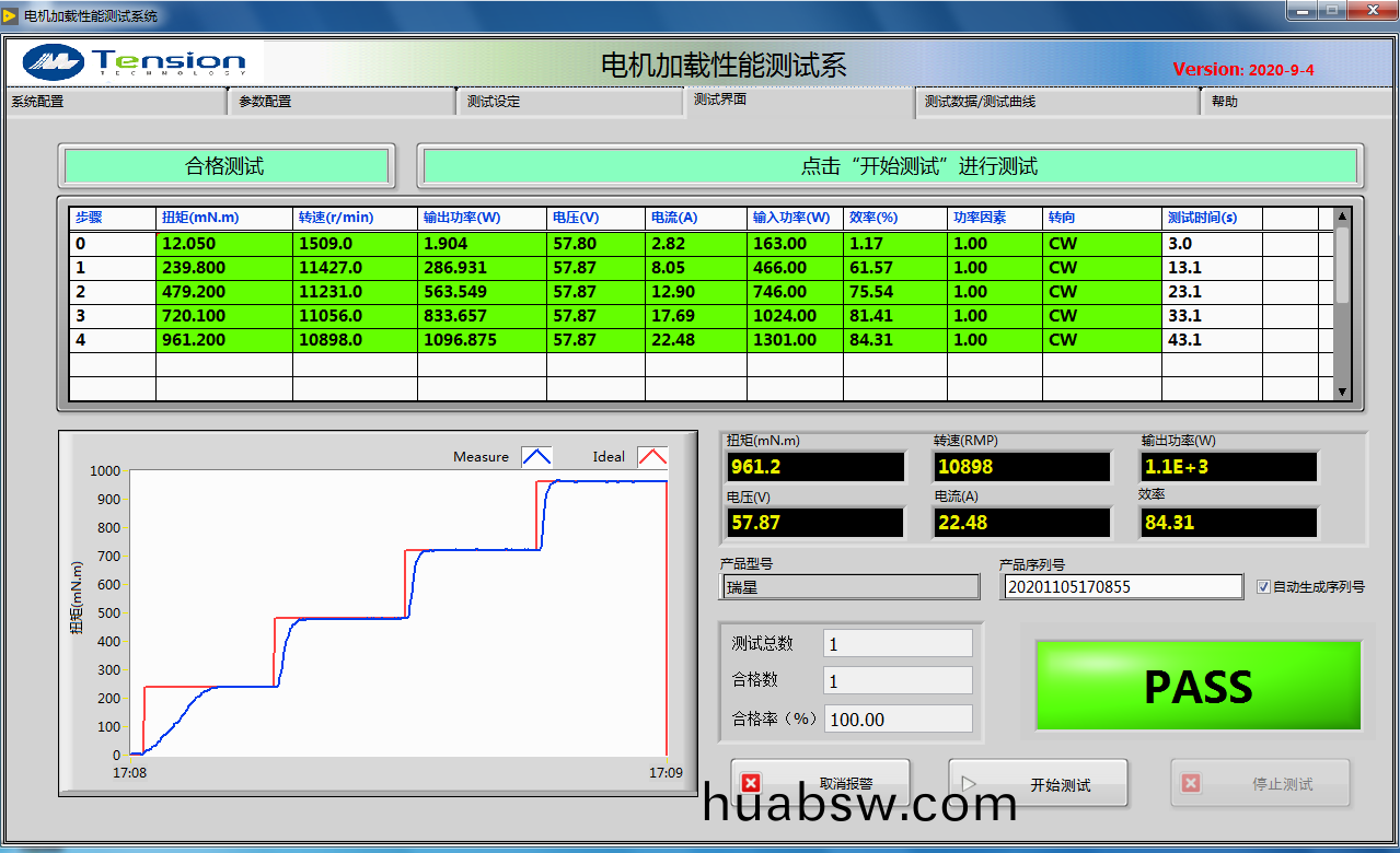 3.合格(ge)不合(he)格测试(shi):(含正(zheng)反转测(ce)试)通过上位(wei)机(ji)软(ruan)件(jian)将被(bei)测电机(ji)运(yun)行在设定(ding)的(de)额(e)定(ding)电压(ya)下(xia),通过测(ce)试(shi)软(ruan)件(jian)让测(ce)功(gong)机输出(chu)设(she)定(ding)负(fu)载(zai),系统可(ke)调(diao)用工(gong)程设(she)定好在某(mou)个(ge)负(fu)载(zai)的给(gei)被(bei)测(ce)产(chan)品(pin)设(she)置的(de)上下(xia)限(xian),并(bing)判断当(dang)前(qian)测(ce)量(liang)参数(shu)是(shi)否(fou)在(zai)其(qi)范围(wei)。