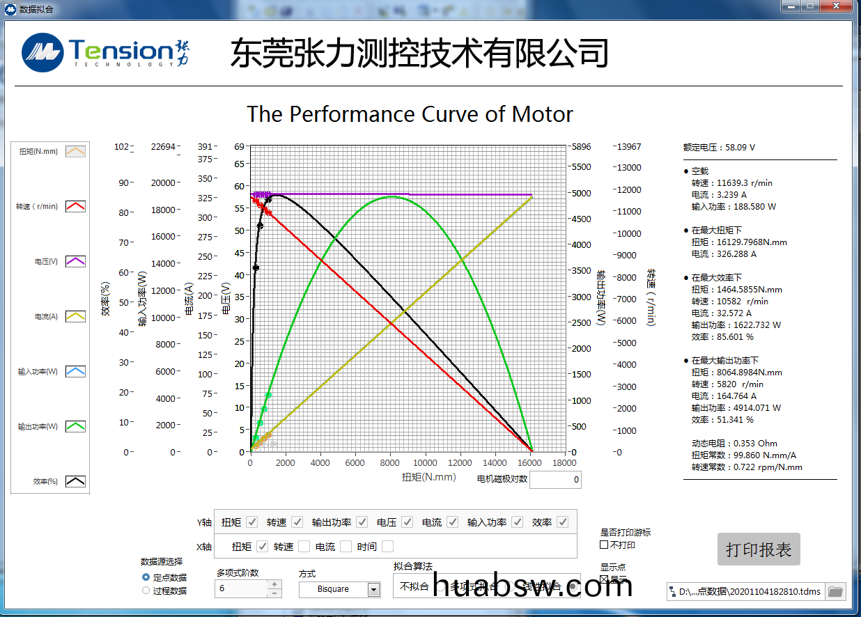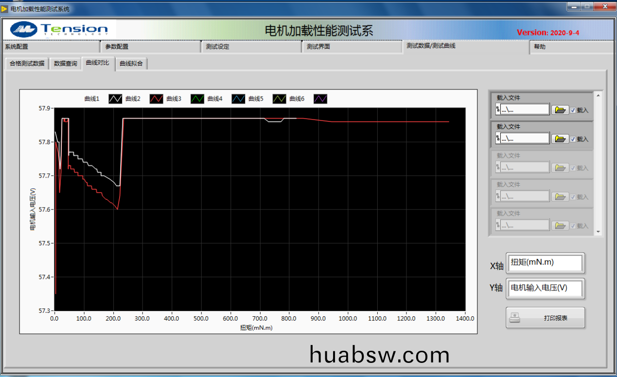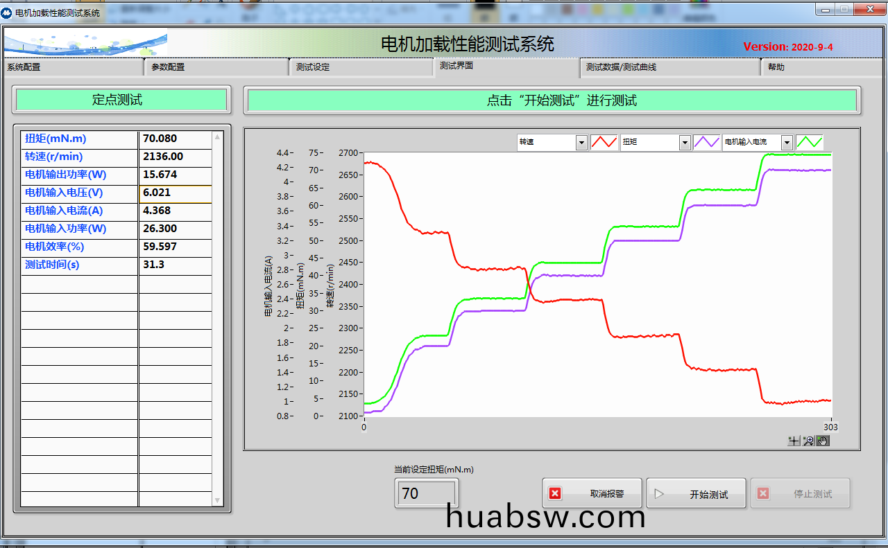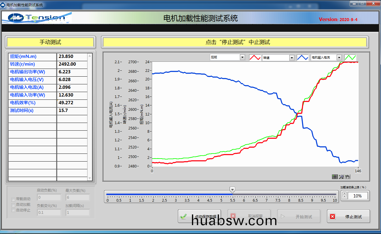 1.手动(dong)加载(zai)试(shi)验(yan):通(tong)过(guo)上(shang)位(wei)机(ji)软(ruan)件(jian)将(jiang)被(bei)测电机(ji)运行在设定的或额(e)定(ding)电压下,通过(guo)操作(zuo)员拉(la)动(dong)软(ruan)件(jian)上(shang)的(de)加载滚动条,来(lai)控(kong)制测(ce)功(gong)机(ji)给被测电(dian)机加载(zai),并(bing)实(shi)时(shi)显(xian)示测试(shi)的数(shu)据(ju)与曲线,如工(gong)作(zuo)特(te)性(xing)曲(qu)线(xian)图,T/N,T/I曲线(xian)等(具(ju)有(you)单(dan)点(dian)手动控制功(gong)能(neng),按设定(ding)的(de)控制(zhi)模式(shi)和设定(ding)的控(kong)制量(liang)控制(zhi)电机工况)