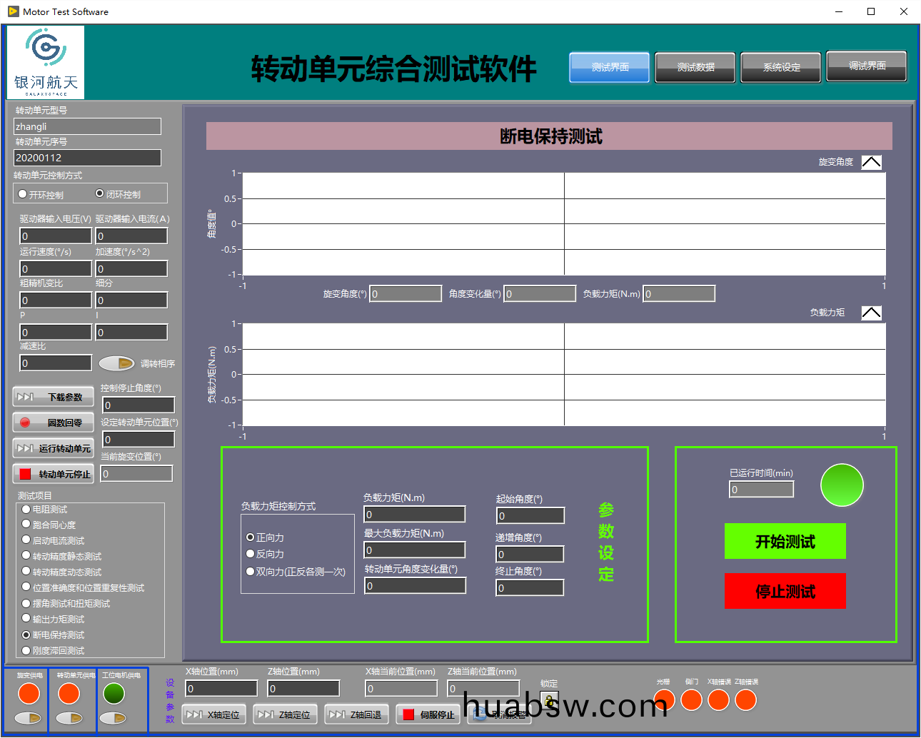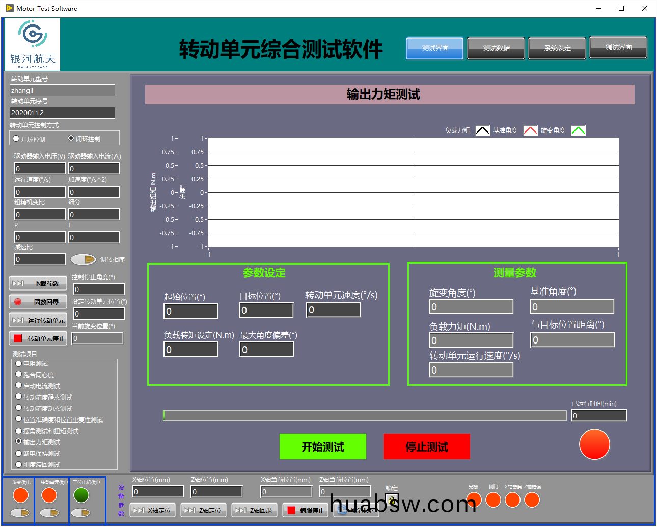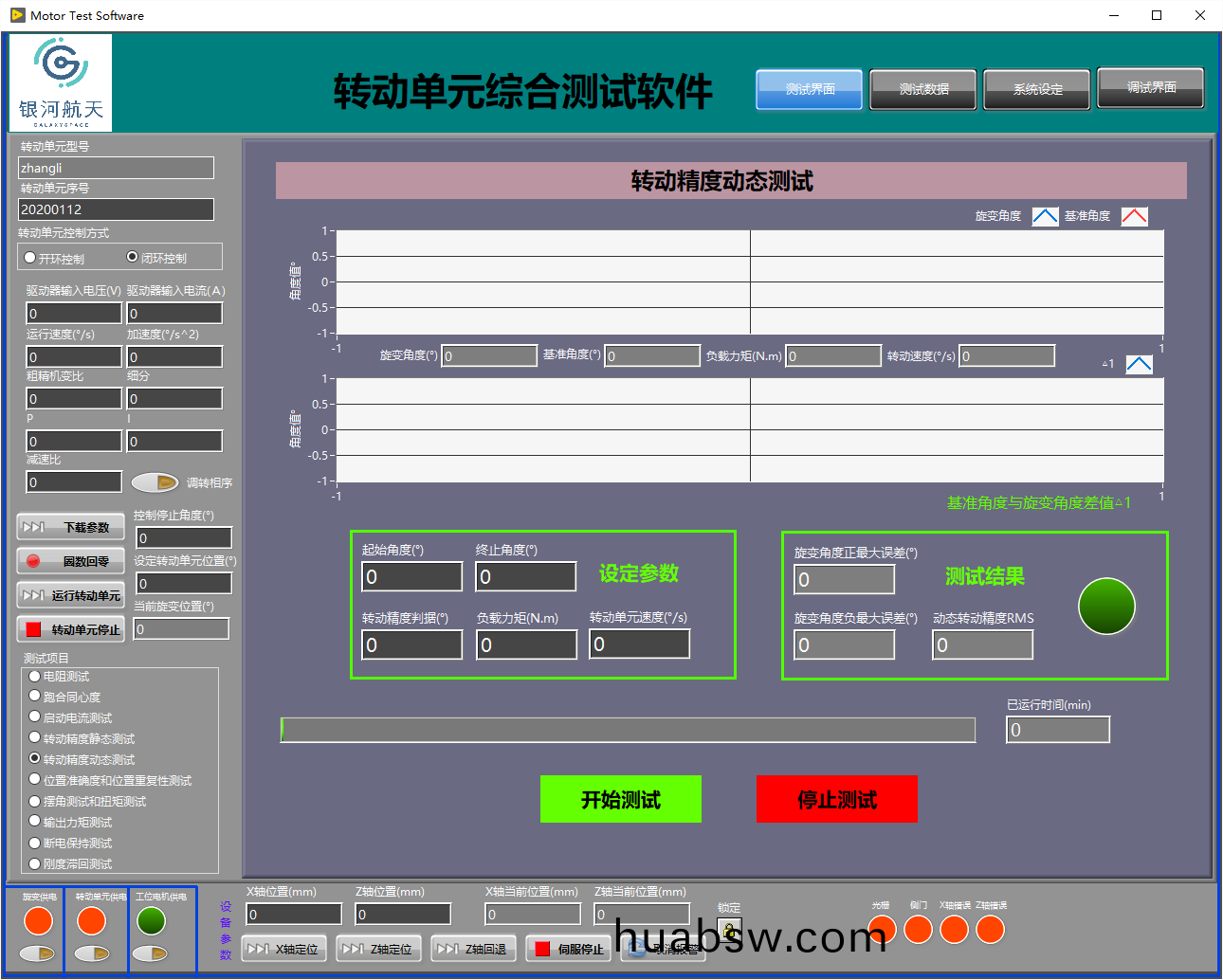 转动(dong)单元测试(shi)系统(tong)由(you)加载系统部(bu)分(fen)(包(bao)含(han)负载电机(ji);伺服(fu)驱动器;扭矩传(chuan)感(gan)器(qi);角(jiao)度传感(gan)器)、 转(zhuan)动单(dan)元测(ce)控系统(tong)部(bu)分(包含(han)工(gong)业控(kong)制计(ji)算(suan)机;加载(zai)控(kong)制(zhi)器(qi);电(dian)机供电电源)、辅助(zhu)单(dan)元(包(bao)含(han)测(ce)试(shi)线(xian)缆;PLC;进(jin)给电(dian)机;测试机架(jia);测(ce)试(shi)工(gong)装等(deng))以(yi)及(ji)相(xiang)应的转动单(dan)元测试(shi)软(ruan)件(jian)等组成(cheng)。测(ce)试软(ruan)件用 LABVIEW 编(bian)写,能够实现电阻测(ce)试,跑(pao)合(he)同(tong)心(xin)度测试(shi),启(qi)动电流测试(shi),转动(dong)精(jing)度动/静(jing)态测(ce)试,位置(zhi)准(zhun)确度和(he)位(wei)置重复(fu)性(xing)测试(shi),摆(bai)角测试和扭矩测(ce)试,输(shu)出(chu)力(li)矩测试(shi),断(duan)电保(bao)持测(ce)试(shi)等(deng)舵(duo)机(ji)特(te)性相(xiang)关的测(ce)试(shi)。(软(ruan)件是可(ke)以(yi)根据(ju)需(xu)求定制的(de))。