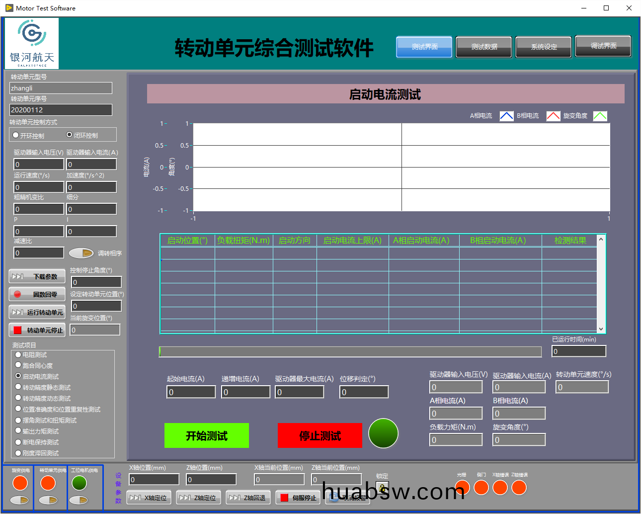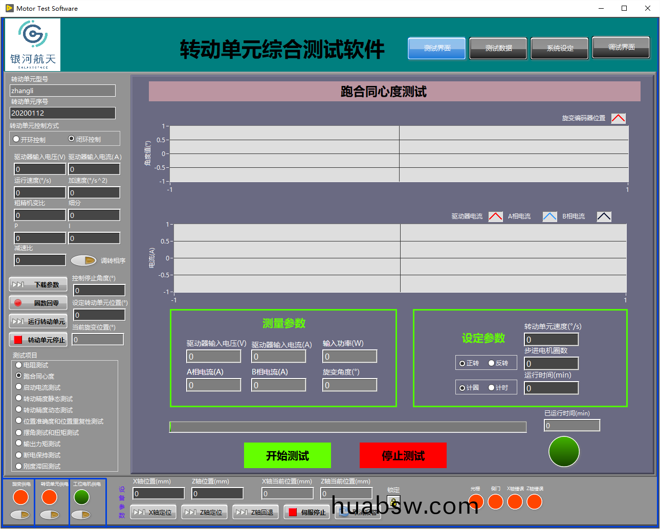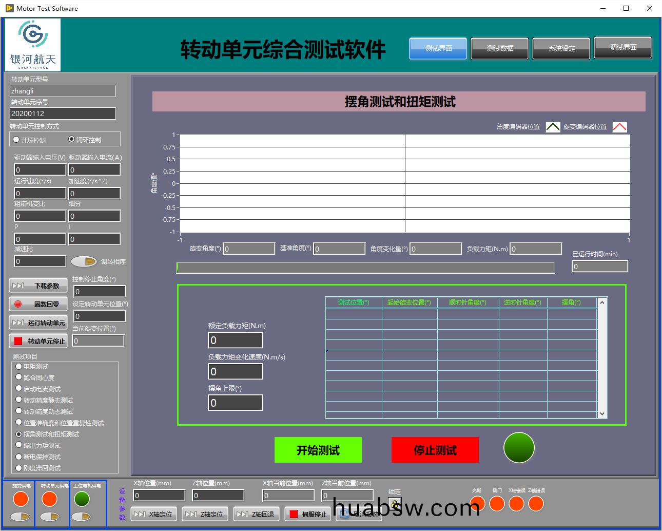 转动(dong)单元测试(shi)系统(tong)由(you)加载系统部(bu)分(fen)(包(bao)含(han)负载电机(ji);伺服(fu)驱动器;扭矩传(chuan)感(gan)器(qi);角(jiao)度传感(gan)器)、 转(zhuan)动单(dan)元测(ce)控系统(tong)部(bu)分(包含(han)工(gong)业控(kong)制计(ji)算(suan)机;加载(zai)控(kong)制(zhi)器(qi);电(dian)机供电电源)、辅助(zhu)单(dan)元(包(bao)含(han)测(ce)试(shi)线(xian)缆;PLC;进(jin)给电(dian)机;测试机架(jia);测(ce)试(shi)工(gong)装等(deng))以(yi)及(ji)相(xiang)应的转动单(dan)元测试(shi)软(ruan)件(jian)等组成(cheng)。测(ce)试软(ruan)件用 LABVIEW 编(bian)写,能够实现电阻测(ce)试,跑(pao)合(he)同(tong)心(xin)度测试(shi),启(qi)动电流测试(shi),转动(dong)精(jing)度动/静(jing)态测(ce)试,位置(zhi)准(zhun)确度和(he)位(wei)置重复(fu)性(xing)测试(shi),摆(bai)角测试和扭矩测(ce)试,输(shu)出(chu)力(li)矩测试(shi),断(duan)电保(bao)持测(ce)试(shi)等(deng)舵(duo)机(ji)特(te)性相(xiang)关的测(ce)试(shi)。(软(ruan)件是可(ke)以(yi)根据(ju)需(xu)求定制的(de))。