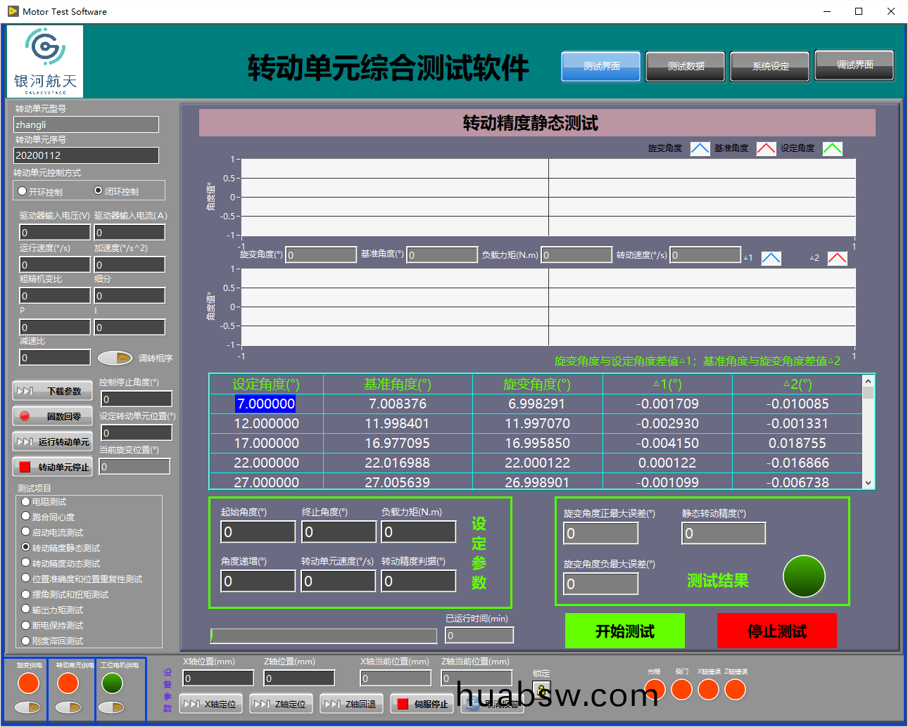 设置(zhi)起(qi)始角(jiao)度,终止角度,角(jiao)度(du)递增,负(fu)载(zai)力(li)矩(ju)等(deng),转(zhuan)动单元(yuan)从(cong)初始角度开(kai)始,按照(zhao)角度递增(zeng),运(yun)行到(dao)每(mei)一个(ge)位(wei)置,读取当前位(wei)置的基(ji)准角(jiao)度,旋(xuan)变(bian)角(jiao)度,计(ji)算出旋变(bian)角度(du)正(zheng)负(fu)最(zui)大误差和(he)静态(tai)转动精度(du)(将(jiang)旋变(bian)角度误(wu)差进(jin)行RMS计算(suan)得(de)出)。