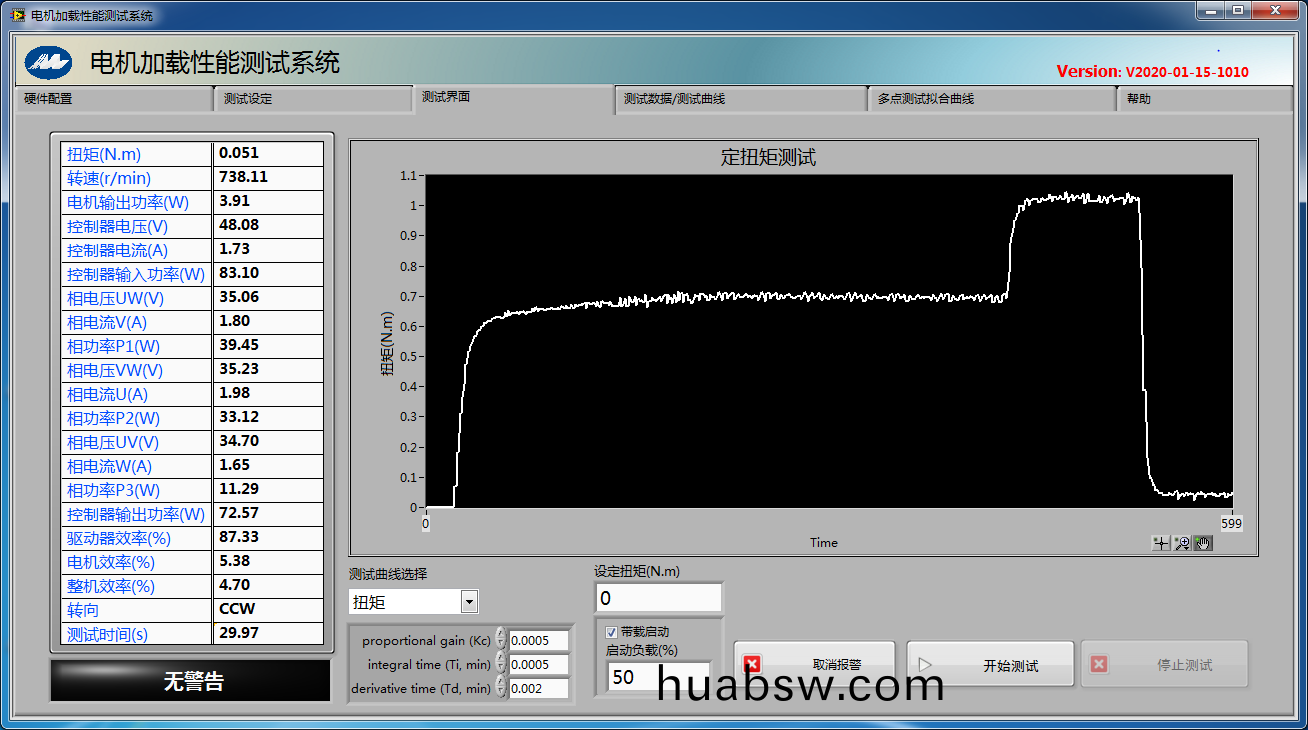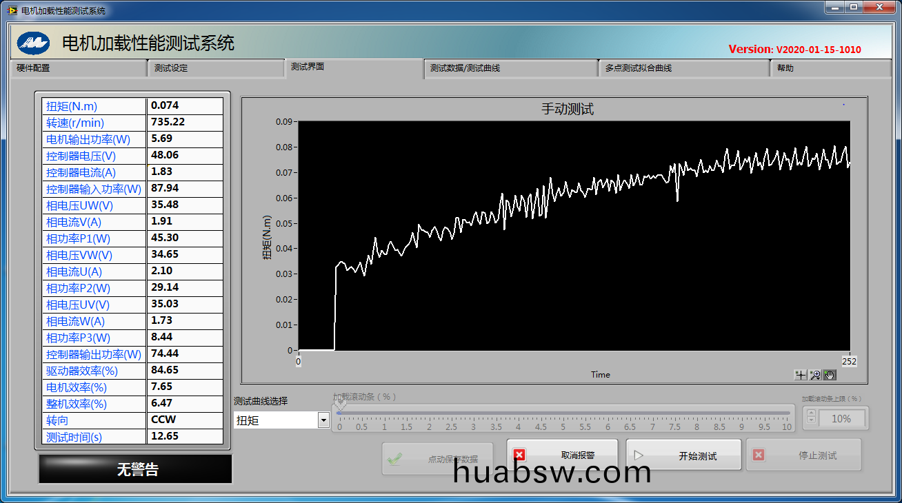 4.测功机加载方式(shi):除(chu)传统(tong)手动励(li)磁(ci)加载方式(shi)外(wai),本系统(tong)具(ju)有多(duo)种自(zi)动(dong)加(jia)载(zai)方式(shi):定励(li)磁增量加(jia)载(zai)方(fang)式,定转矩(ju)增量(liang)加(jia)载方(fang)式(shi),定(ding)转(zhuan)速增(zeng)量加(jia)载(zai)方(fang)式(shi),定转矩加(jia)载方式,定转(zhuan)速加(jia)载(zai)方式(shi)和定斜(xie)率(lv)加载方式。