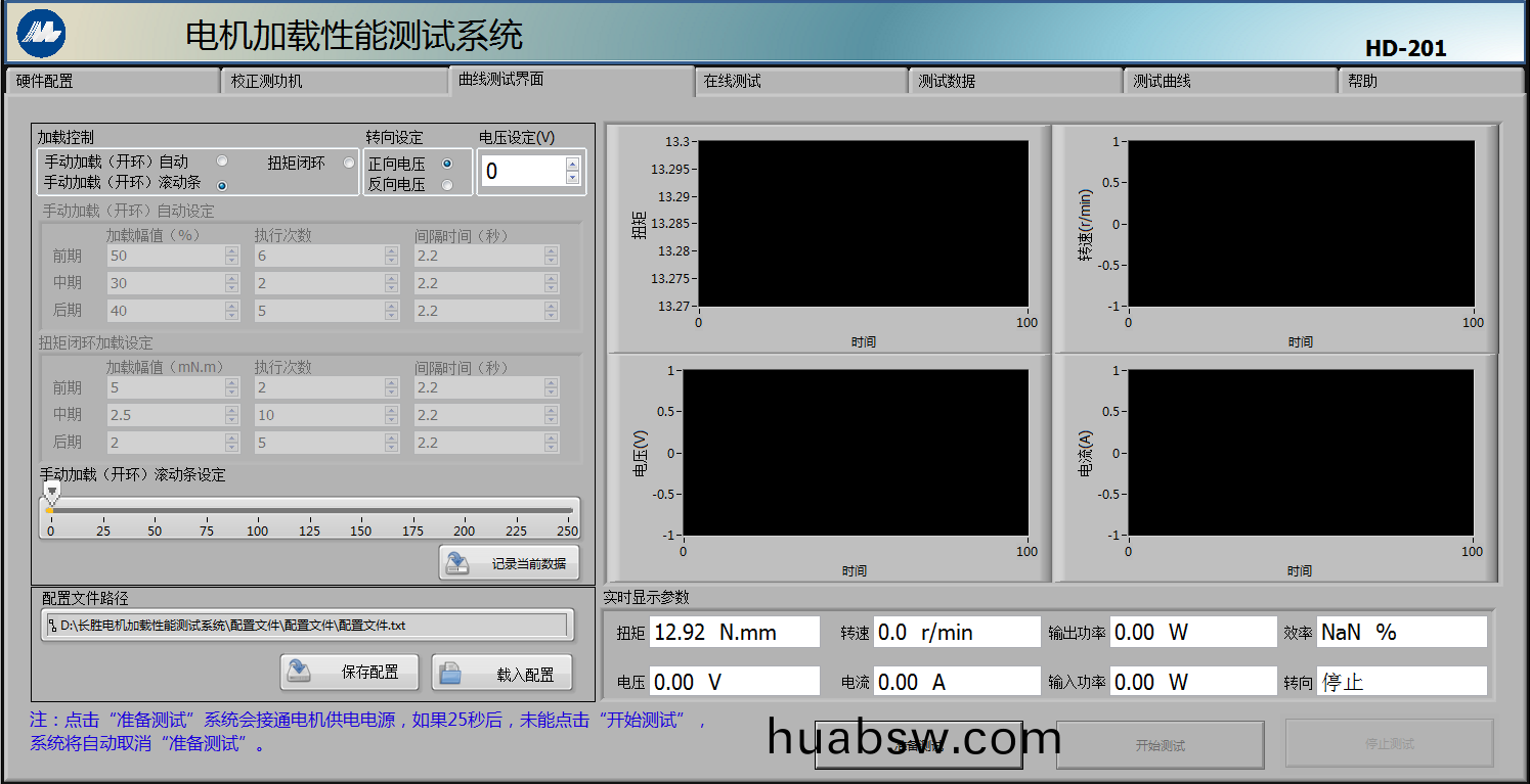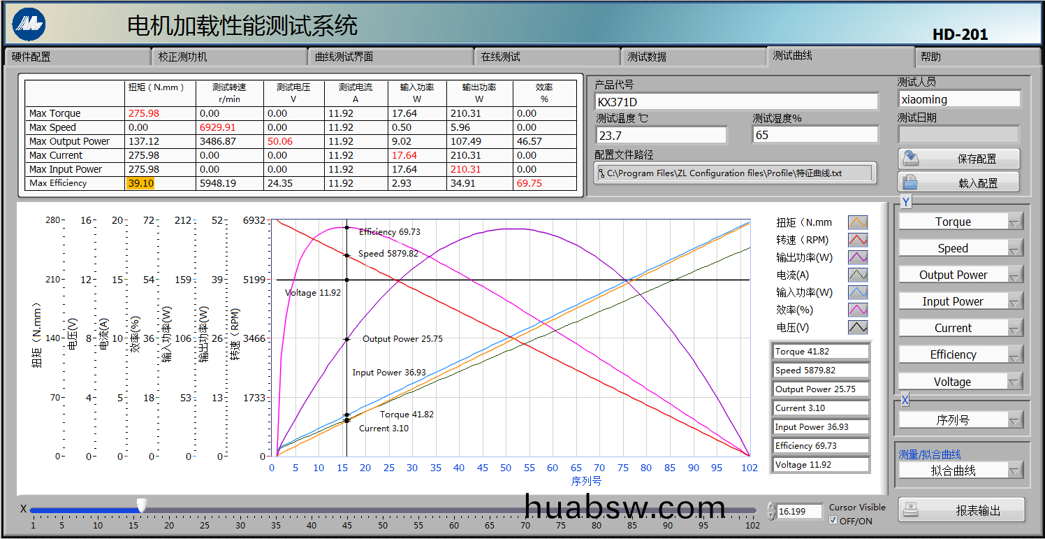 4.测(ce)试(shi)软(ruan)件(jian)用(yong)LABVIEW编(bian)写,具(ju)有(you)特(te)色(se)的测试与(yu)图形绘制功(gong)能,可以(yi)计算(suan)并显(xian)示多(duo)个参数(扭(niu)矩(ju),转速,输(shu)出(chu)功率,电压(ya),电(dian)流(liu),输入功率,效(xiao)率(lv),转向等(deng))