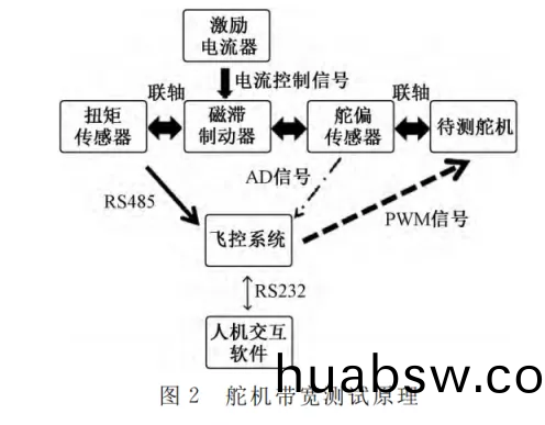 带(dai)宽测试(shi)原理(li)如图2所示,扭矩传(chuan)感器(qi)、磁(ci)滞制动器、 舵偏(pian)角传感器(qi)以及(ji)待测(ce)舵机(ji)通(tong)过联轴(zhou)器(qi)连接(jie),以(yi)减小间(jian)隙, 并固定(ding)于(yu)舵(duo)机测试(shi)台架上(shang)。磁滞制动(dong)器是一种优越的扭(niu)矩控制设(she)备(bei),利(li)用磁制(zhi)原(yuan)理通(tong)过(guo)控制(zhi)输(shu)入(ru)的励磁电流(liu)产生(sheng)连(lian)续可(ke)调(diao)的负载(zai)扭矩(ju),且(qie)控制电(dian)流和(he)输出扭矩(ju)具有较好的线性(xing)关(guan)系,实现(xian)舵(duo)机任意(yi)载(zai)荷(he)谱的自动加载(zai);扭矩传感器(qi)用(yong)于(yu)测定舵(duo)机实(shi)际受(shou)到(dao)的扭矩;飞(fei)控系(xi)统(tong)是(shi)整(zheng)个测试系统(tong)的核(he) 心(xin),主要功(gong)能为(wei):1)响(xiang)应(ying)人(ren)机(ji)交互软件(jian)对(dui)舵(duo)机(ji)激励信(xin)号(hao)的(de)配(pei)置,包(bao)括激励(li)信(xin)号(hao)幅值(zhi)、频率及执行(xing)时(shi)间等(deng);2)输(shu)出(chu)不(bu)同频(pin) 率的(de)正弦(xian)激励(li) PWM 信(xin)号驱(qu)动待(dai)测(ce)舵(duo)机;3)通过舵偏(pian)角传感(gan)器(qi)实(shi)时采集舵机输出响(xiang)应;4)记(ji)录(lu)保(bao)存(cun)各试验(yan)点数据(ju),包(bao) 括(kuo)时(shi)间、扭矩(ju)、输入指(zhi)令以(yi)及(ji)输(shu)出(chu)响应数(shu)据等(deng)。