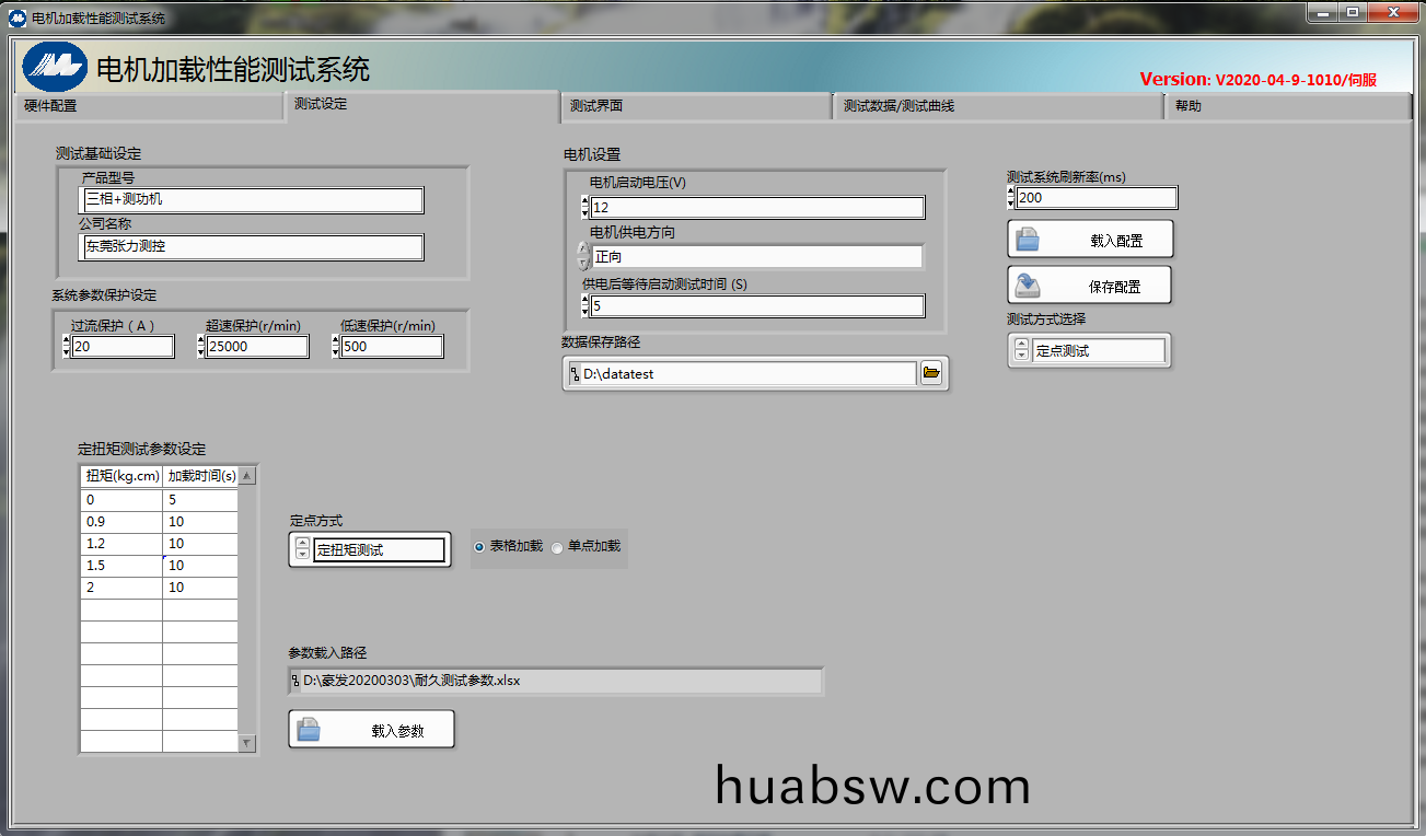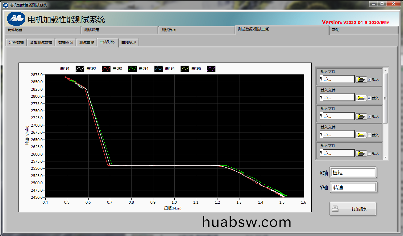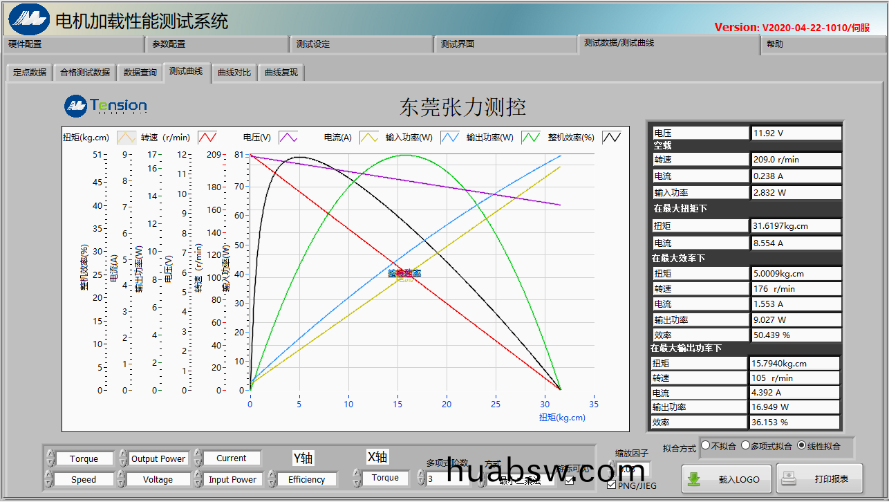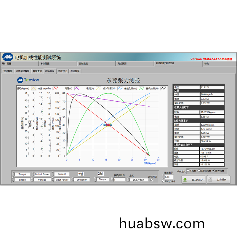 •自(zi)动(dong)测试方(fang)式(shi):即(ji)负载根据(ju)设置自(zi)动(dong)加载(zai),扫描(miao)出(chu)电(dian)机从(cong)空(kong)载到(dao)堵(du)转(或设定值(zhi))的特(te)征曲(qu)线(xian)。因为(wei)电机(ji)在(zai)零(ling)载(zai)到相(xiang)应(ying)负载(zai)和(he)相应负(fu)载(zai)到空载这个(ge)过(guo)程中,下(xia)降曲(qu)线(xian)和回(hui)升曲线是(shi)存在(zai)相(xiang)应误(wu)差(cha),系统(tong)可以(yi)通(tong)过(guo)下降(jiang)曲线(xian)和回(hui)升曲线(xian)计(ji)算(suan)拟合出(chu)电(dian)机(ji)最(zui)真(zhen)实(shi)的曲线(xian),所(suo)以此(ci)界(jie)面(mian)就(jiu)是最好的测试方式(shi)。