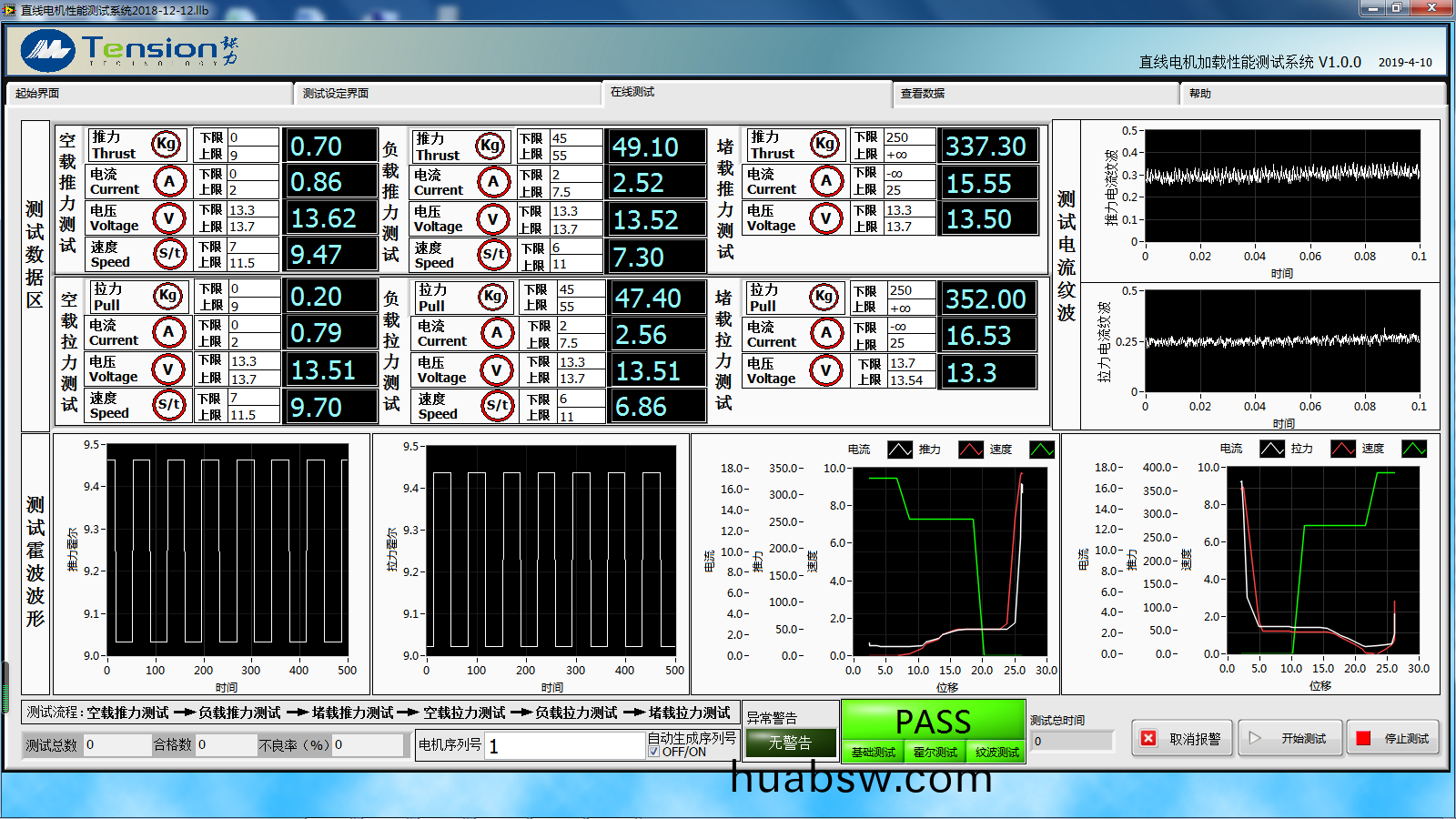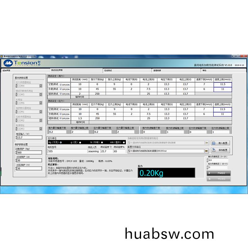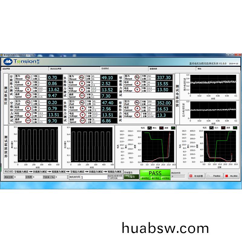C0-MTSF-2800LH该(gai)系统(tong)采(cai)用(yong)伺服(fu)电机加(jia)载(zai)检测(ce)被(bei)测(ce)电(dian)机在空(kong)载与(yu)负(fu)载状态(tai)下的推力(li)与拉(la)力(li),包括电(dian)机(ji)速(su)度(du)、电压(ya)、电(dian)流(liu)、行程(cheng)等参数(shu),以及电(dian)机(ji)在堵转下的(de)电流与(yu)推拉力,同(tong)时在(zai)测试(shi)过程(cheng)中可以(yi)检测电(dian)机(ji)的(de)电流纹(wen)波(bo)及霍(huo)尔(er)信(xin)号,整(zheng)套(tao)测(ce)试软件(jian)实(shi)在(zai)LABVIEW环境(jing)下开发的(de),具(ju)有(you)友(you)好的(de)测试(shi)界(jie)面与(yu)图(tu)形(xing)分析(xi)功能(neng),可以同时(shi)计(ji)算并显(xian)示多(duo)个参(can)数(shu)(推(tui)拉力(li)、转速、移(yi)动距(ju)离、电(dian)压电流(liu)等), 系统将工(gong)程(cheng)师(shi)与(yu)操(cao)作(zuo)员界面(mian)分开(kai),便(bian)于管(guan)理,测(ce)试数(shu)据可(ke)以(yi)查(cha)询(xun)、储(chu)存(cun)并(bing)可以(yi)下载(zai),可以(yi)根据(ju)客户的(de)要求生(sheng)成(cheng)特(te)定(ding)的报(bao)告格(ge)式(shi)。