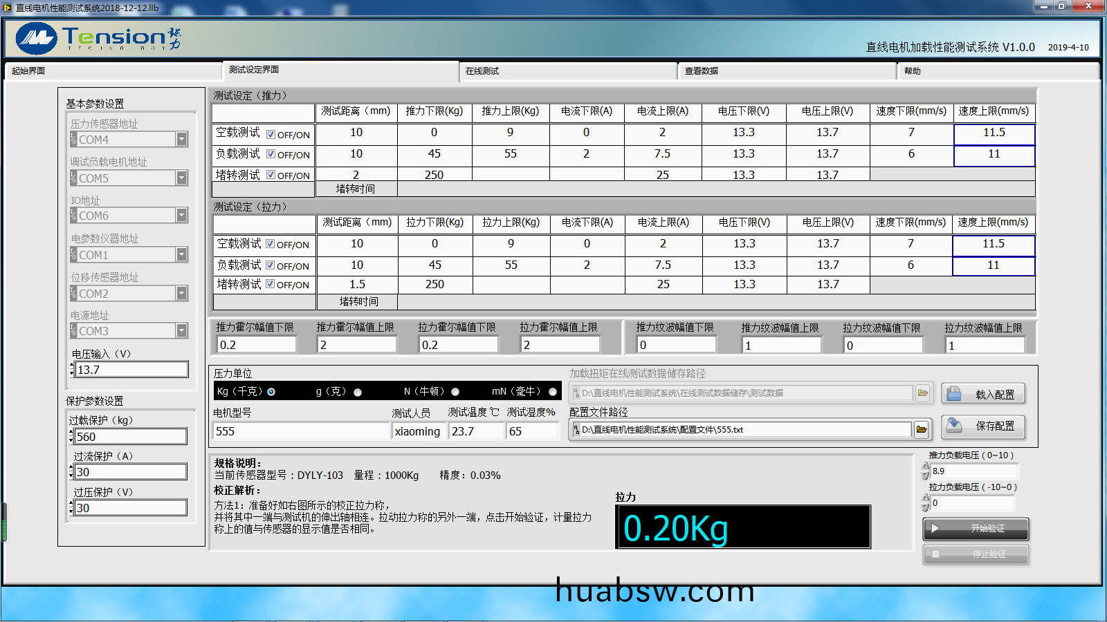 •具(ju)有(you)手动加载(zai),自动(dong)加(jia)载,定距(ju)离测试空载(zai)、负(fu)载、堵住推拉力,如(ru)电(dian)机行(xing)程(cheng)为(wei)50mm, 用户(hu)可以自(zi)行(xing)设(she)定(ding)前(qian)0-10mm为(wei)空(kong)载(zai)测试,10-40mm为负载测试(shi),40-50mm为堵转测(ce)试